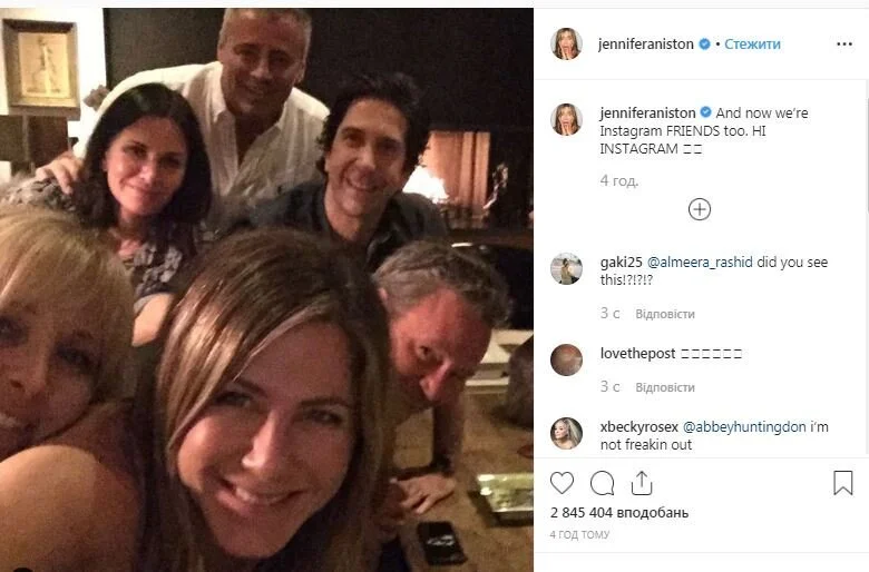 Дженнифер Энистон выложила фото с "Друзьями" в Instagram Актриса на днях зарегистрировалась в Instagram. Первое фото Энистон выложила с актерами сериала "Друзья".