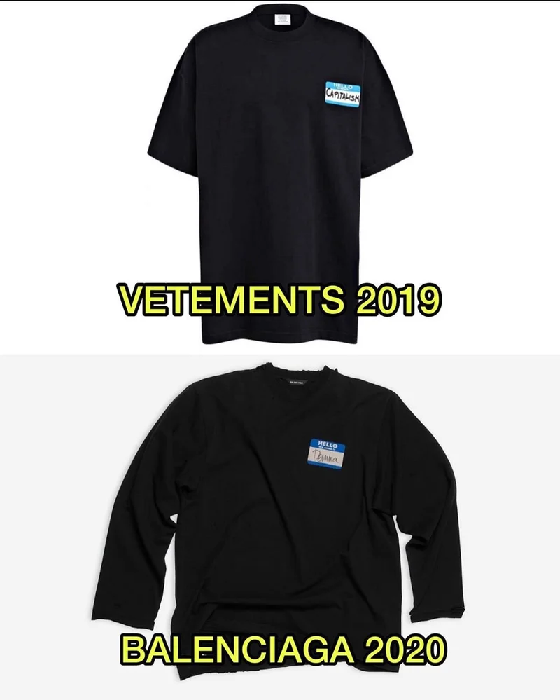 Vetements уличил Balenciaga в плагиате Vetements уличил Balenciaga в копировании дизайна футболки с именным стикером на груди для коллекции весна-лето 2020. , Леди