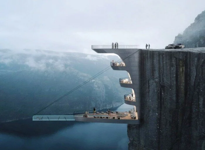 В Норвегии появится отель на вершине скалы высотой 600 метров Концепция отеля подразумевает не только номера с выступающими из скалы балконами, но и наличие подвешенного над пропастью бассейна с прозрачным дном.