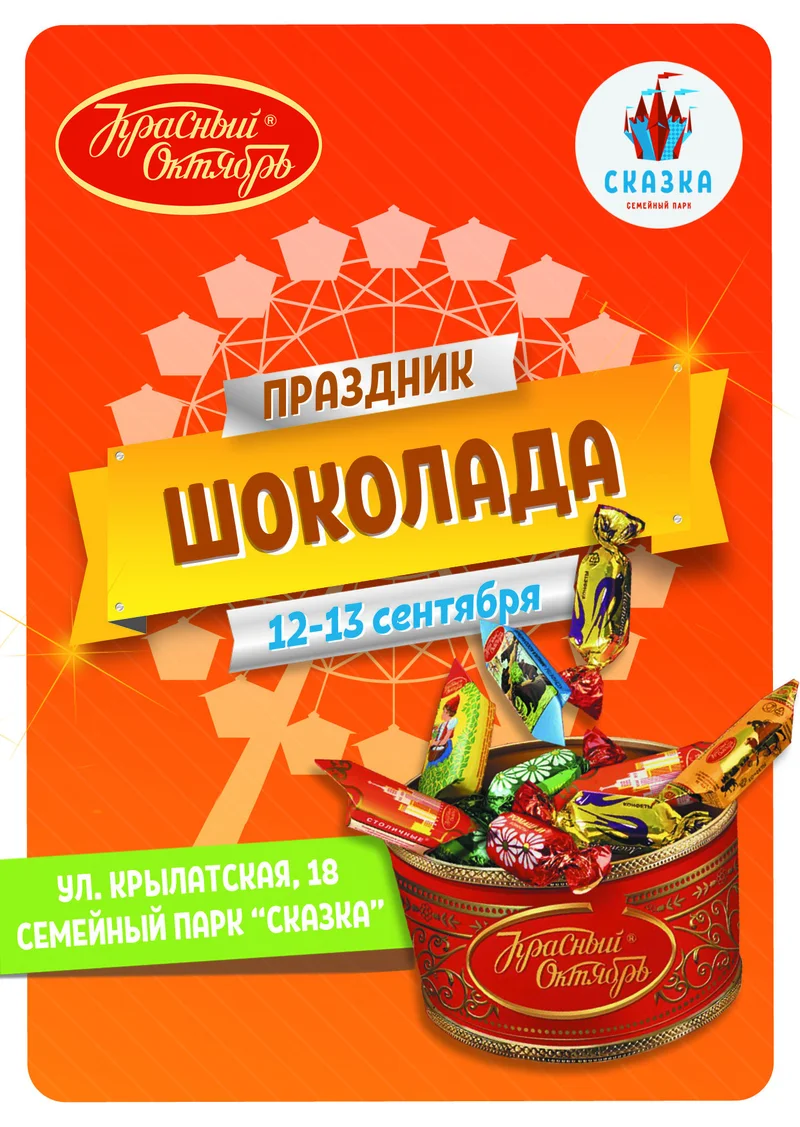 12 и 13 сентября состоится Праздник шоколада в парке «Сказка» в Крылатском Праздник организован легендарной флагманской кондитерской фабрикой «Красный Октябрь», семейным Парком «Сказка» при поддержке «Москва Медиа» и телеканала «Москва 24», а также Ассоциации анимационного кино России (ААКР) и анимационной студии «Сказка» кинокомпании «СТВ». , Новости