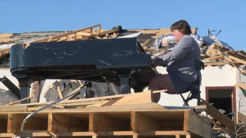 Музыка посреди хаоса: Женщина сыграла на развалинах церкви Жительница пораженного торнадо города решила приободрить его жителей , Общество