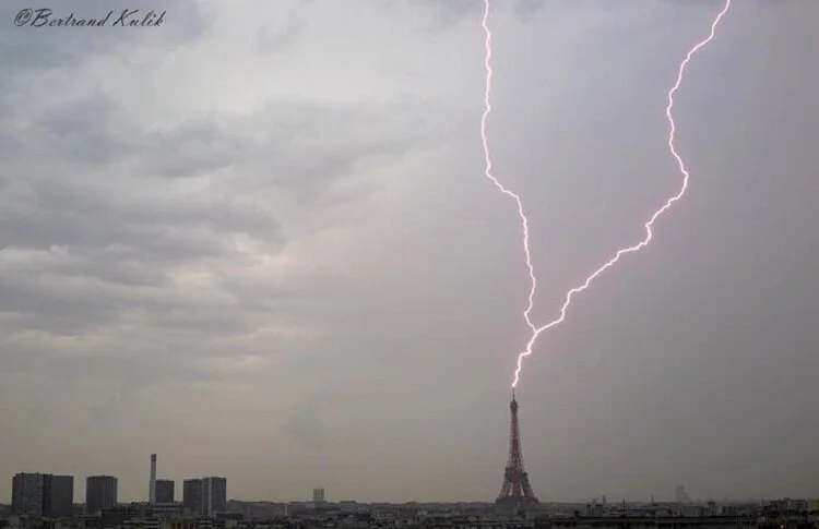 В Эйфелеву башню угодил сильнейший заряд молнии Знаменитое строение уже не впервые сталкивается с разгулом стихии. , Общество